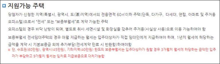 먼저, 신청지역에서의 전용면적 60제곱미터 이하 주택으로 ‘전세’ 또는 ‘보증부 월세’로 계약이 가능한 주택이어야 하며,