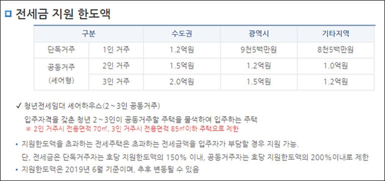 공동거주의 경우 2인거주시 수도권의 경우 1.5억, 광역시는 1.2억, 기타지역은1억이 지원가능하며, 3인거주시 수도권 2억, 광역시 1.5억, 기타지역 1.2억원가량 지원이 가능합니다.
