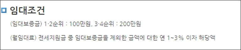 청년 전세임대 주택의 경우 임대 보증금은 1,2순위는 100만 원 3,4순위는 200만 원이며, 월 임대료는 전세지원금 중 임대 보증금을 제외한 금액에 대한 연 1~3% 이자 해당액입니다.