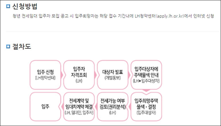 LH 청약 센터를 통해 공고를 보고 신청 -> 입주자 자격 조회 -> 대상자 발표 (서류 대상자) -> 입주대상자에 주택 물색 안내 -> 입주 희망 주택 물색 및 결정 -> 전세 가능 여부 검토 후 마지막으로 전세 계약 및 임대차 계약 체결 순으로 진행됩니다.