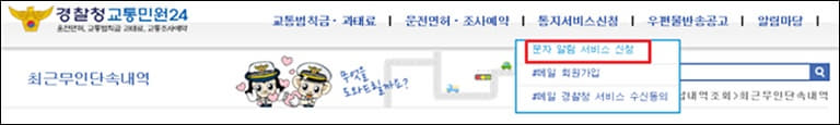 과태료를 확인하신 후에도 추후에 발생되는 사고에 대해 문자로 알림을 받아보고 싶으신 분들을 위한 문자알림서비스가 있는데요, 이 서비스는 다시 홈페이지로 돌아가 화면 상단 메뉴에서 신청이 가능합니다.