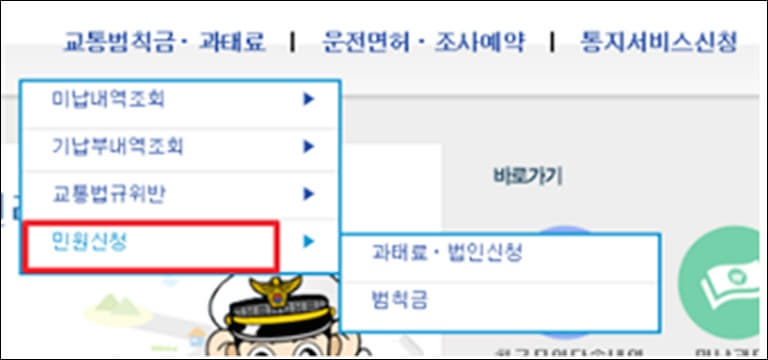 홈페이지 상단에 교통범칙금, 과태료 버튼을 클릭하시며 '민원신청' 버튼을 눌러 신청이 가능합니다.