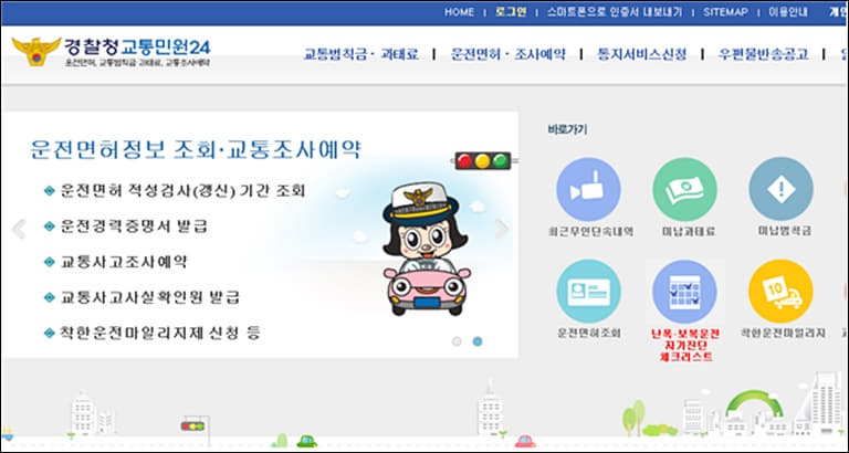 경찰청 교통민원 홈페이지에 접속하면 위의 이미지처럼 여러 메뉴가 보입니다.