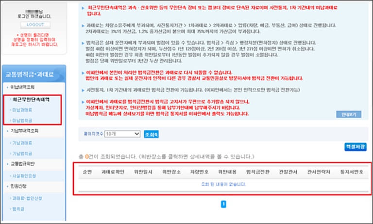 조회 확인 가능한 항목은 최근 무인단속 내역과 미납 과태료, 미납 범칙금입니다.